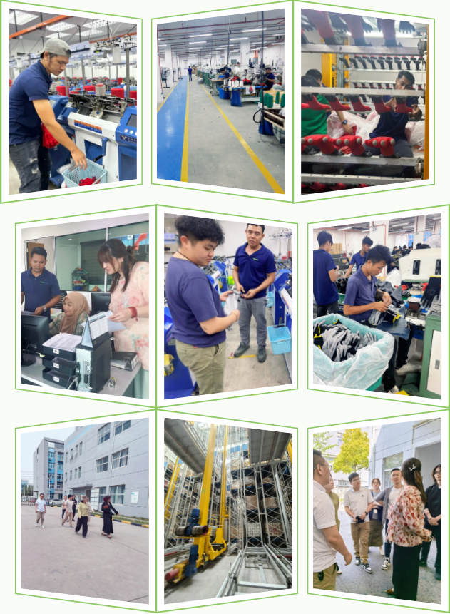 团队深入Duramitt核心生产区,系统考察了纱线包覆、针织成型、浸胶处理及缝制加工全流程生产线,并实地观摩智能立体仓储系统运作。